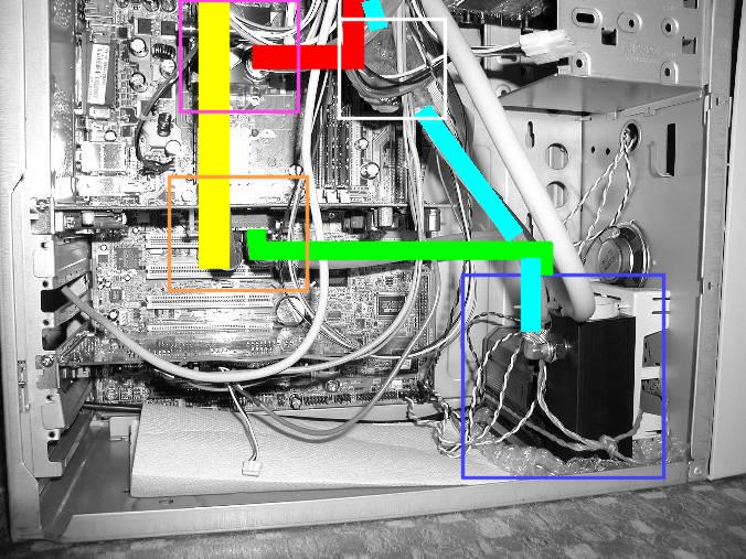 In the image above, you can see how it works. The pump is in the blue square. It is linked via the green line to the graphics card (orange square), which cools the NV25 with the coolest water. From there, the now very warm water follows the yellow line to the CPU (violet square). There, the water pics up a little more heat and then follows the red line to the radiator (not on image).